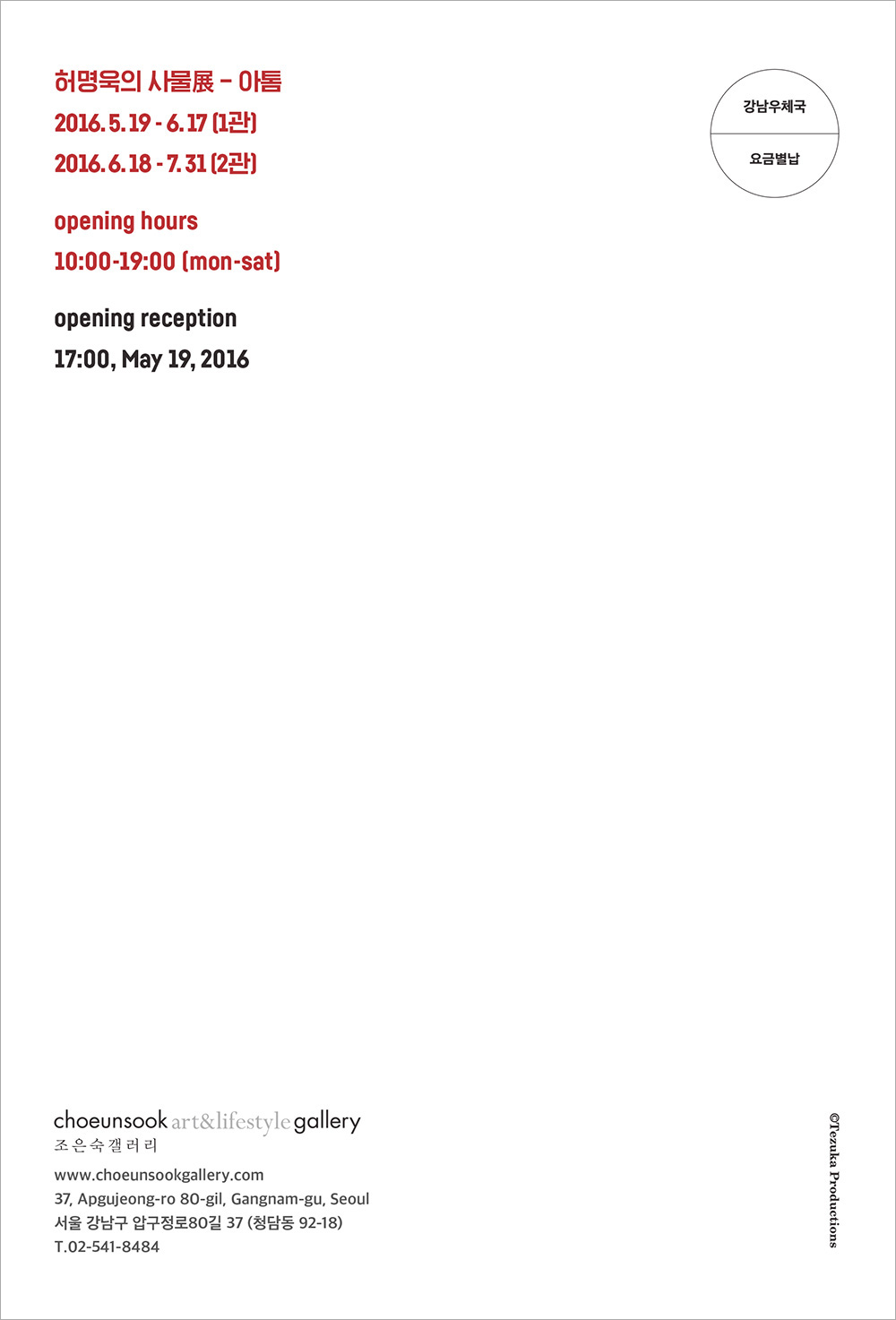 작가는 자신의 세계를 고유한 조형적 범주로 채워간다. 그러나 허명욱의 작업을 특정한 범주로 가두어 말할 수 없음은 그의 작업이 가지고 있는 예민하고도 유연한 경계성에 그 이유를 두어야 할 것 같다. 그가 세워온 경계는 고정된 영역의 범주를 두르는 것이 아니라 영역을 흐르는 시간 위를 부유하는 변화의 기록으로 존재한다. 고도가 다른 시간의 층들이 충돌하여 비켜선 자리가 진공의 공간이 되었다. 시간의 수집가로, 흔적의 채집가로 여러 층의 틈새를 다니며 주어 모은 사물을 위한 자리이다. 이 곳은 어느 시간 위에나 기대어 있었던 소년을 위한 사물의 집이다. 작가가 멈춰 세운 그 시간이다.